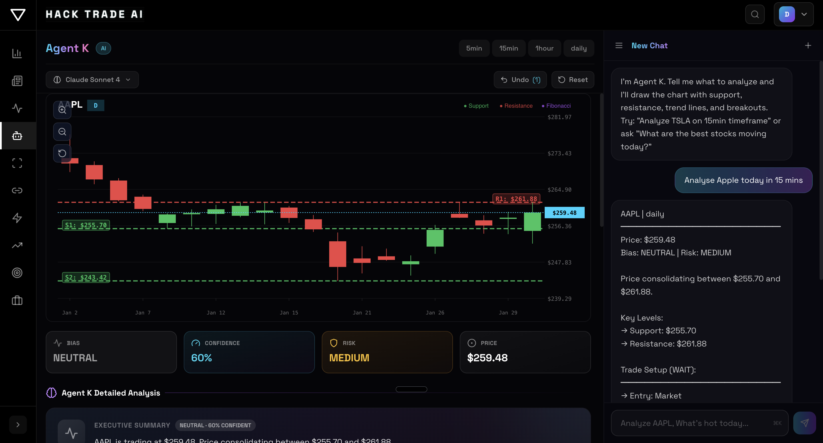 Just tell Agent K what you want: "Analyze NVDA on 15-minute timeframe"— and watch it draw support, resistance, trend lines, and give you exact entry/exit points.